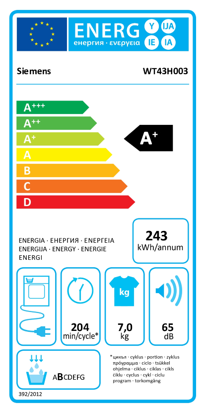 Ob es sich um einen Kondensationstrockner handelt, können Sie auch am Energielabel erkennen: Kondenstrockner sind durch eine Wasserschublade oben links im Gerätesymbol gekennzeichnet.